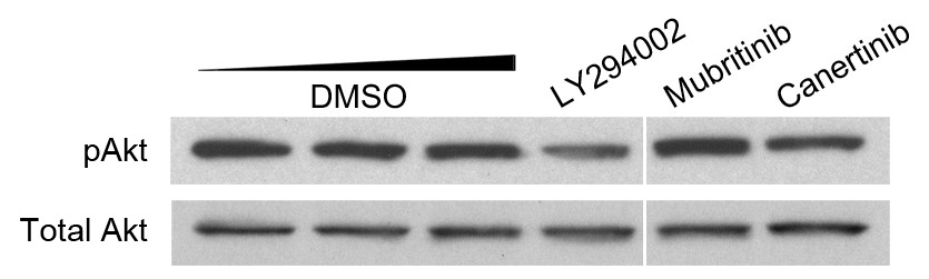 Mubritinib inhibits Akt phosphorylation in Xenopus XTC cells. Western blot of XTC cells transfected with X.laevis ErbB2 and GFP-myc, serum starved for 18 hours, and treated with either DMSO or 600 nM mubritinib for one hour. Mubritinib dramatically decreased phosphorylation in one of two Akt isoforms (pAkt) compared to DMSO-treated controls. GFP-myc was co-transfected with ErbB2 to account for variation in transfection efficiency that could result in changes to receptor protein levels. |