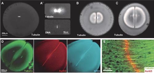 these images. (A,A′) Egg fixed ∼60 min after fertilization, at metaphase of first mitosis. Note the spindle is small compared to the egg. (B,