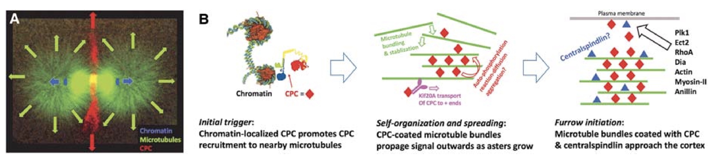 to the axis of chromosome separation (blue arrows). (B) Models for the molecular events involved in triggering formation of the CPCpositive disc near chromatin (left), growing it outward (middle), and signaling to the cortex (right).