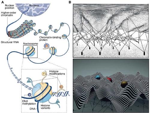 (A) Numerous epigenetic factors help organize chromatin in the 4D nucleus: along with the linker histone H1, DNAwrapped around one