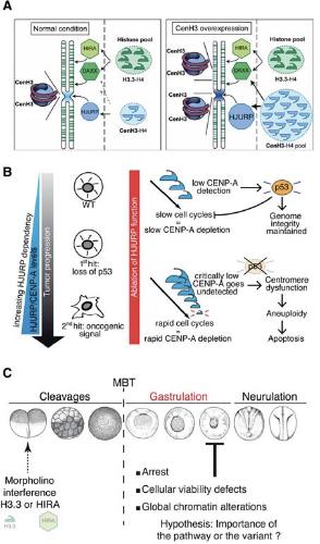 2012). Depletion of endogenous H3.3 impairs cellular viability leading to gastrulation defects. Histone chaperone HIRA knockdown gives rise to similar phenotypes, implicating the DNA synthesis-independent H3.3 incorporation pathway during development. (A, Adapted, with permission, from Lacoste et al. 2014;