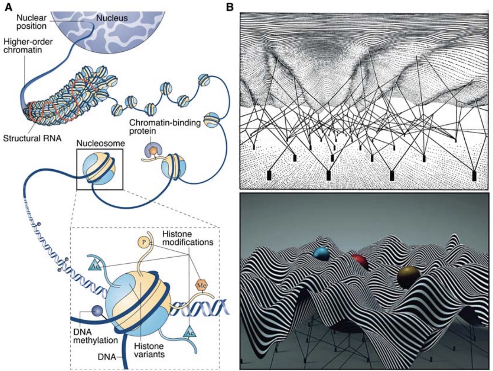 information. (B) View from below of the historical Waddington landscape (top). Pegs represent genes and the strings represent a complex