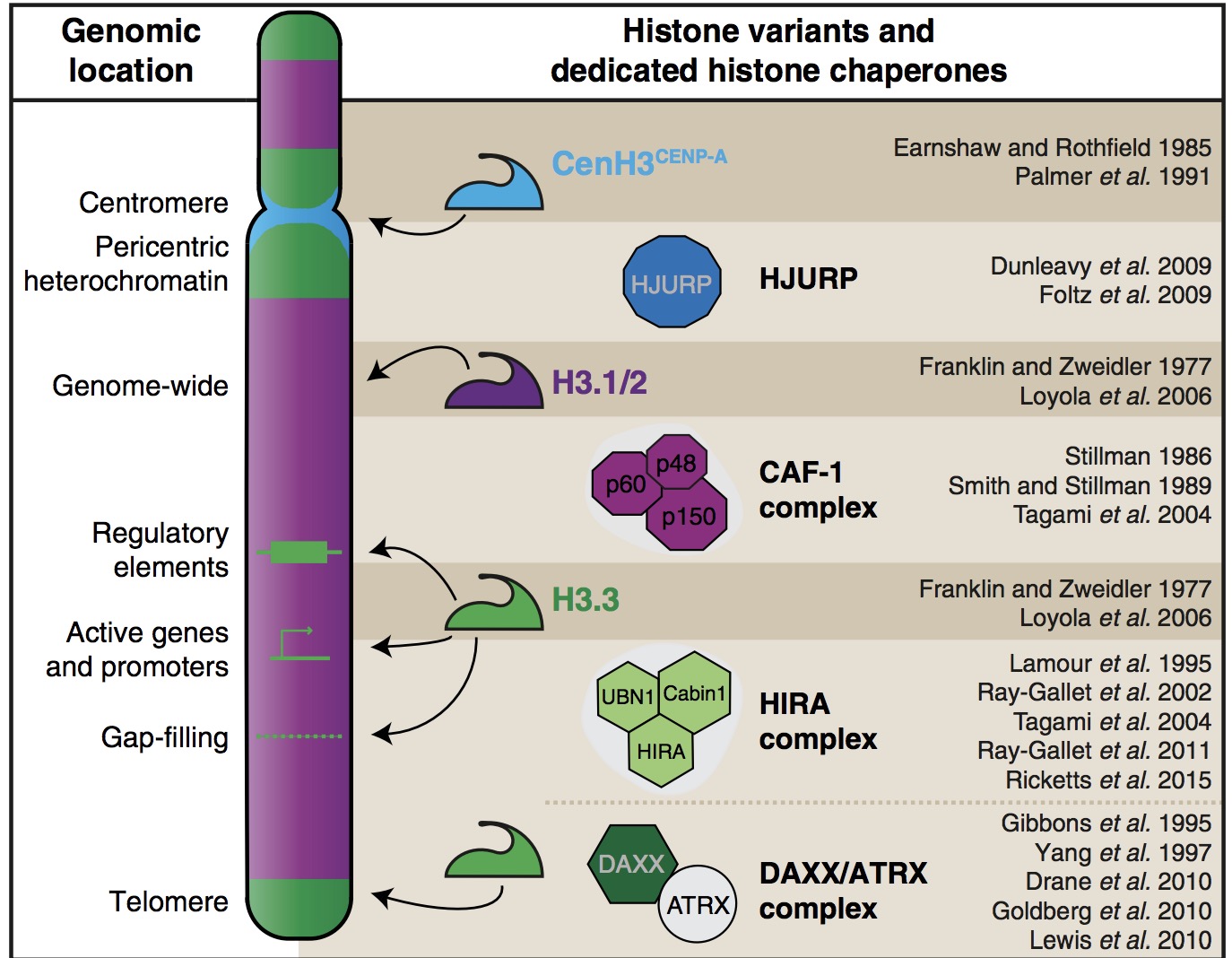 Figure 2. Histone variants (bricks) and their associated histone chaperones (architects) mark specific chromosomal regions. Among H3