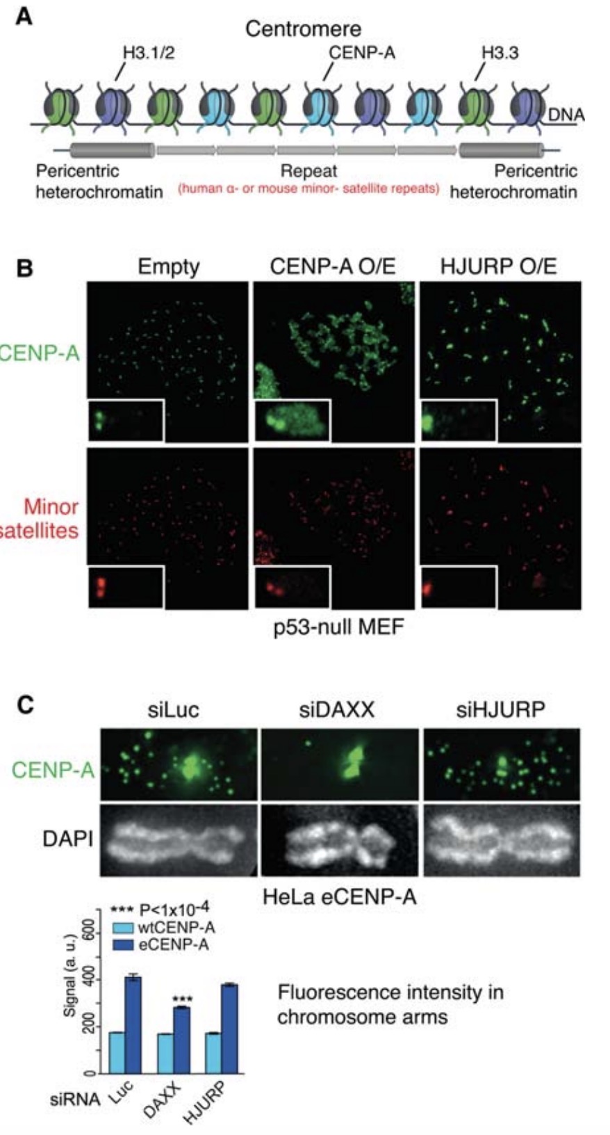 Figure 3. DAXX mediates ectopic CENP-A deposition in chromosome arms. (A) Schematic representation of centromeric chromatin. Centromeres comprise CENP-A nucleosomes interspersed with H3.1/2 and H3.3 nucleosomes. Centromeric chromatin contains minor- (in mice) and α- (in humans) satellite repeats flanked by pericentric heterochromatin. (B) DNA FISH on metaphase spreads of p53-null mouse embryonic fibroblasts (MEFs) transduced with the indicated retroviral construct. Cells were stained with an antibody against CENP-A and LNA FISH (fluorescence in situ hybridization) probes for minor satellites (site of centromeric CENP-A deposition). Insets show individual magnified chromosomes. Overexpression (O/E) of CENPA, but not HJURP, leads to ectopic deposition of CENP-A on chromosome arms. (C) Fluorescent microscopy visualization of CENP-A after treatment with the indicated siRNA in a human cell line overexpressing CENP-A (HeLa eCENP-A). Depletion of histone chaperone DAXX, but not HJURP, rescues the ectopic CENP-A deposition phenotype. Histogram representing the fluorescence of CENP-A present in chromosome arms of metaphase spreads from two cell lines (wild-type, wtCENP-A