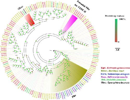 Figure 5. Phylogenetic analysis of EgriORs with other typical insect ORs. Phylogenetic tree was constructed in PhyML3.0 using maximum likelihood method.