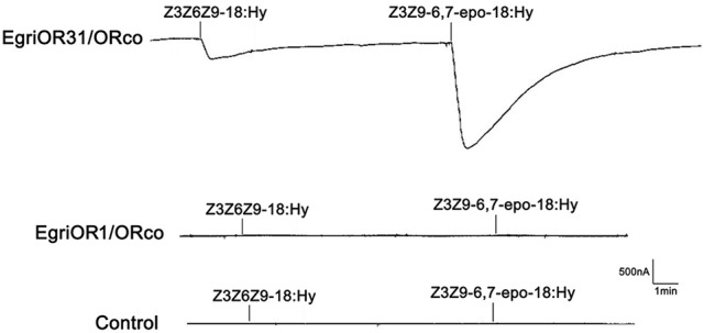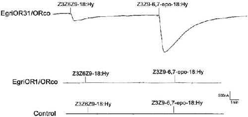 Figure 9. Responses of Xenopus oocytes co-expressing EgriOR31/EgriORco and EgriOR1/EgriORco to stimulations with pheromone compounds. Inward current responses of EgriOR31/EgriORco and EgriOR1/EgriORco Xenopus oocytes in response to 10−5 M solutions of sex pheromone compounds.