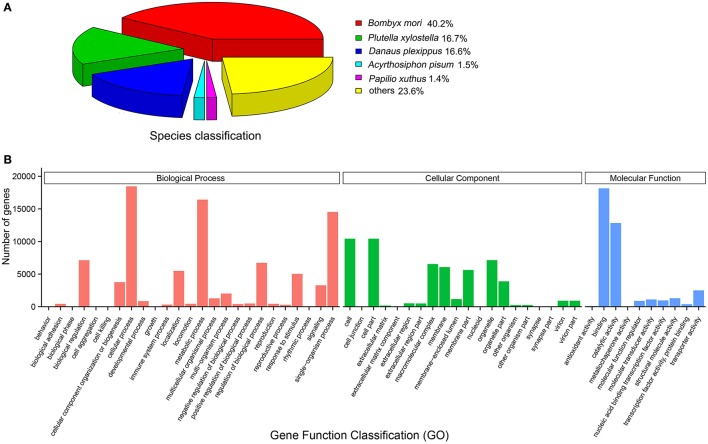 Figure 1. Annotation summaries for E. grisescens transcripts. (A) Species distribution of transcripts with best hit annotation terms in non-redundant (NR) database. (B) Gene ontology (GO) classifications of E. grisescens transcripts.