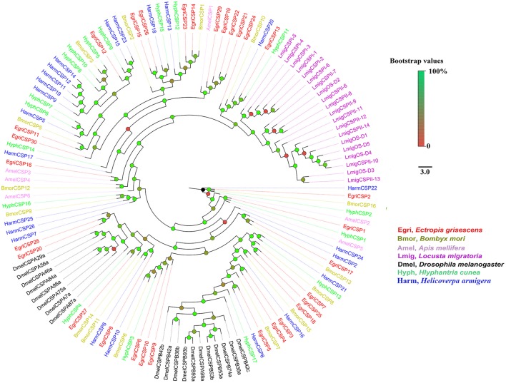 Figure 4. Phylogenetic analysis of EgriCSPs with other typical insect CSPs. Phylogenetic tree was constructed in PhyML3.0 using maximum likelihood method.