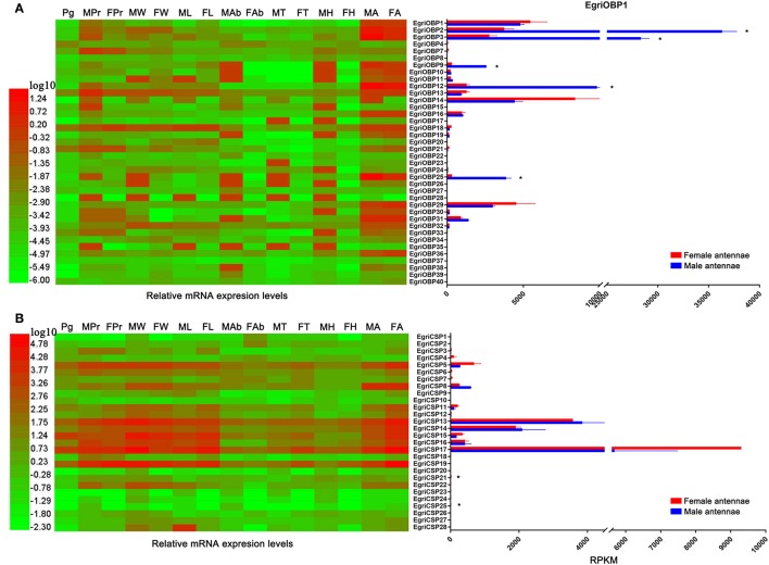 Figure 7. Tissue expression profiles and abundance of selected EgriOBP and EgriCSP genes in antennae based on relative mRNA quantity and RPKM values. Heat map illustrates Log10-transformated mRNA expression levels of EgriOBP and EgriCSP in different tissues. Histogram shows RPKM values of EgriOBP and EgriCSP. (A) Tissue expression profile and RPKM values of selected EgriOBP genes. (B) Tissue expression profile and RPKM values of selected EgriCSP genes. FA, female antennae; MA, male antennae; FH, female head without antennae; MH, male head without antennae; FT, female thorax; MT, male thorax; FAb, female abdomen without pheromone glad; MAb, male abdomen; FL, female legs; ML, male legs; FW, female wings; MW, male wings; FPr, female proboscis; MPr, male proboscis; Pg, pheromone gland. *P-value < 0.05.