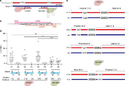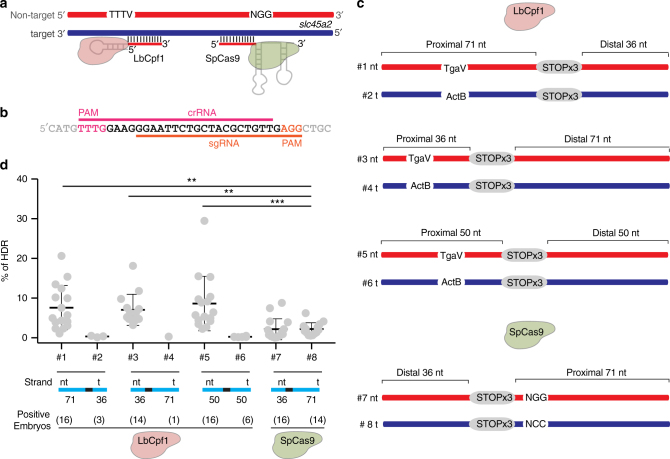Fig. 4. LbCpf1-mediated homology-directed repair. a Schematic illustrating LbCpf1âcrRNA RNP complex and SpCas9âsgRNA RNP complex interaction with their respective DNA targets. crRNA and sgRNA-DNA annealing occurs on the target strand (blue), and PAM sequences are in the non-target strand (red). b crRNA (pink line) and sgRNA (orange line) overlapping target sequences in the albino locus used for this analysis. c Schema illustrating different donor ssDNA (#1â6) complementary to either the target strand (t) or non-target strand (nt) and with symmetric or asymmetric homology arms used in combination with LbCpf1âcrRNA. PAM sequence was modified (TgaV/ActB) to prevent new editing post-HDR. An optimized ssDNA donor (#8) described for SpCas9-induced HDR19 and its complementary version (#7) were used in combination with SpCas9âsgRNA RNP complexes as references for comparison (bottom). d qPCR quantification showing % of HDR from individual embryos when using LbCpf1 and different ssDNA donors in comparison to SpCas9. % of HDR: amount of integrated DNA per total amount of genomic DNA per embryo (see Methods for details). Results are shown as the averagesâ±âS.D. of the means from 16 embryos in two independent experiments (nâ=â8 embryos per experiment). Positive embryos: number of embryos per condition showing a detectable qPCR amplification signal. The data were analyzed by KruskalâWallis test followed by Dunnâs post test for significance vs. control condition (#8), **pâ<â0.01, ***Pâ<â0.001 |
