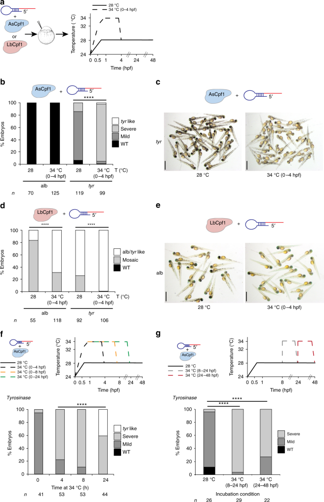 Fig. 2. Temperature is a key factor modulating Cpf1 activity in vitro and in vivo. a Schema illustrating different temperature incubations after Cpf1âcrRNA RNP complex injections targeting slc45a2 (alb) and tyr. b Phenotypic evaluation of AsCpf1âcrRNA RNP complex (10âfmol) injections at different temperature incubations (T). Stacked barplots showing the percentage of tyr-like (white), severe mutant (light gray), mild mutant (dark gray), and phenotypically WT (black) embryos 48âhpf after injection. Number of embryos evaluated (n) is shown for each condition. Ï 2-test (****pâ<â0.0001). c A representative picture showing 48-hpf-old embryos obtained after AsCpf1âcrRNA RNP complex injections targeting tyr at different temperature incubations. Scale bar, 1.25âmm. d Phenotypic evaluation of LbCpf1âcrRNA RNP complex (10âfmol) injections at different temperature incubations (T). Stacked barplots showing the percentage of alb/tyr-like (white), mosaic mutants (gray), and phenotypically WT (black) embryos 48âhpf after injection. Number of embryos evaluated (n) is shown for each condition. Ï 2-test (****pâ<â0.0001). e A representative picture showing 48-hpf-old embryos obtained after LbCpf1âcrRNA RNP complex injections targeting slc45a2 at different temperature incubations. Scale bar, 1.25âmm. f Schematic illustrating different incubation conditions (0, 4, 8, or 24âh at 34â°C, then at 28â°C) after AsCpf1âcrRNA RNP complex (10âfmol) injections targeting tyr in zebrafish (top). Phenotypic evaluation of AsCpf1âcrRNA RNP complex injections targeting tyr in the conditions described above (bottom). Stacked barplots showing the percentage of tyr-like (white), severe mutant (light gray), mild mutant (dark gray), and phenotypically WT (black) embryos 48âhpf after injection. Number of embryos evaluated (n) is shown for each condition. Ï 2-test (****pâ<â0.0001). g Schematic illustrating different incubation conditions: 8âh at 28â°C, 16âh at 34â°C, and then 24âh at 28â°C (34â°C 8â24âhpf) or 24âh at 28â°C, then 24âh at 34â°C (34â°C 24â48âhpf) after AsCpf1âcrRNA RNP complex (10âfmol) injections targeting tyr in zebrafish (top). Phenotypic evaluation of AsCpf1âcrRNA RNP complex injections targeting tyr in the conditions described above (bottom). Stacked barplots showing the percentage of severe mutant (light gray), mild mutant (dark gray), and phenotypically WT (black) embryos 48âhpf after injection. Number of embryos evaluated (n) is shown for each condition. Ï 2-test (****pâ<â0.0001) |