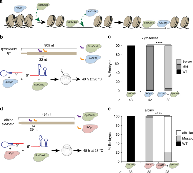 Fig. 3. Catalytic dead SpCas9 (SpdCas9) proximal targeting increases Cpf1 activity. a Schematic diagram of proxy-CRISPR approach. Temperature may control Cpf1 activity to access and/or unwind genomic DNA, impeding AsCpf1 to access the genomic target in vivo at 28â°C. When SpdCas9 binds in the proximity of the AsCpf1 target, it facilitates the availability of AsCpf1 to cleave the inaccessible target. b Diagram illustrating crRNA 1 (orange) and a proximal sgRNA (purple) targeting tyr exon 1 (Supplementary Fig. 10c and Supplementary Data 1) in zebrafish (top). AsCpf1âcrRNA and/or SpdCas9-sgRNA RNP complexes were injected into one-cell-stage embryos and then incubated at 28â°C for 48âh (bottom). c Phenotypic evaluation of the experiment described in (b). Stacked barplots showing the percentage of severe mutant (light gray), mild mutant (dark gray), and phenotypically WT (black) embryos 48âhpf after injection. Number of embryos evaluated (n) is shown for each condition. Ï 2-test (****pâ<â0.0001). d Diagram illustrating crRNA 2 (orange) and sgRNA 2 (purple) targeting alb exon 1 (Supplementary Data 1, Supplementary Figs. 3f and 8e) in zebrafish (top). LbCpf1âcrRNA and/or SpdCas9-sgRNA RNP complexes were injected into one-cell-stage embryos and then incubated at 28â°C for 48âh (bottom). e Phenotypic evaluation of the experiment described in (d). Stacked barplots showing the percentage of alb-like (white), mosaic mutants (gray) and phenotypically WT (black) embryos 48âhpf after injection. Number of embryos evaluated (n) is shown for each condition. Ï 2-test (****pâ<â0.0001) |