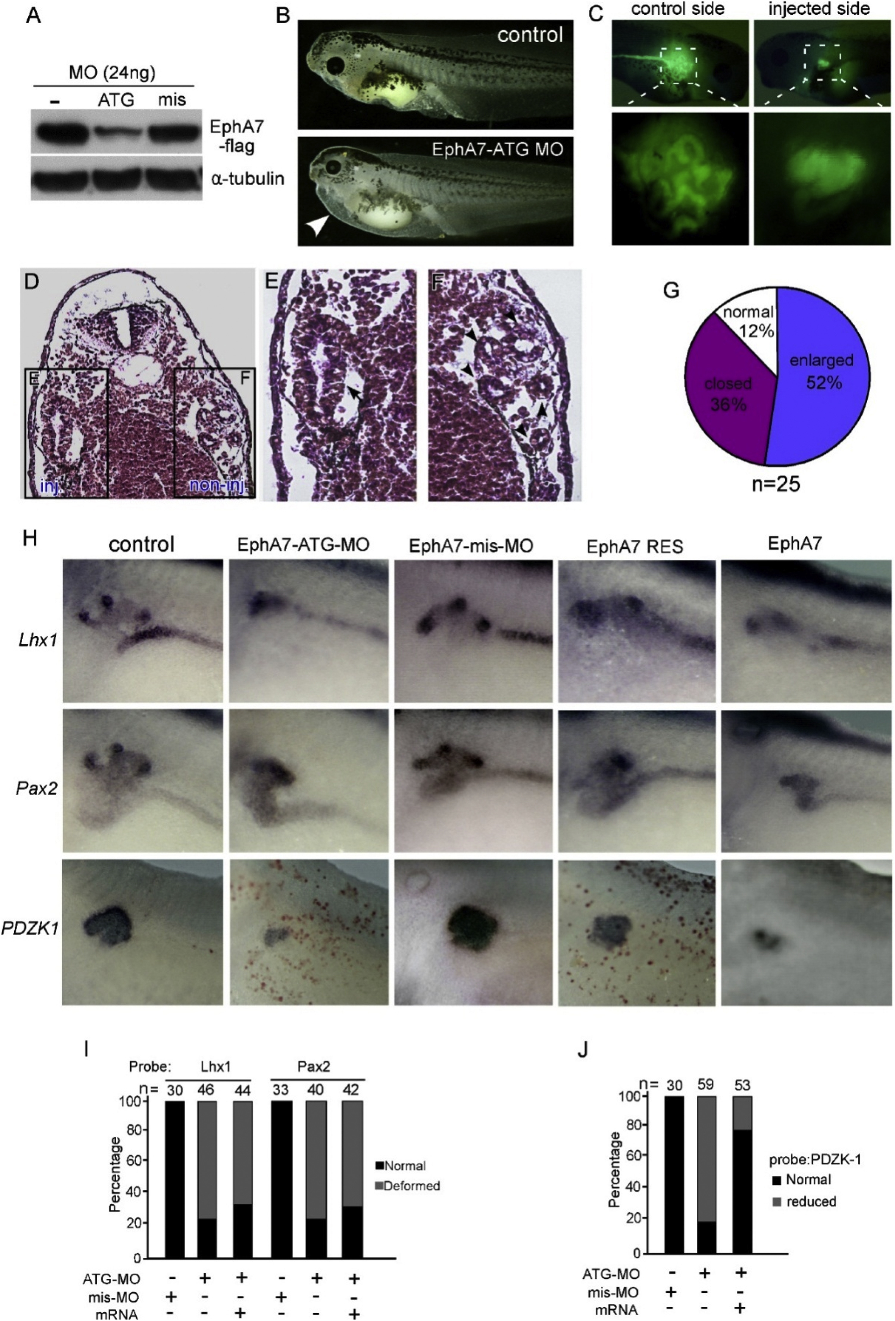 Fig. 1. EphA7 is required for pronephros development. (A) Injection of the EphA7-ATG-MO reduced exogenous EphA7 level from stage11 embryos as revealed by western blot. α-tubulin, loading control. (B) Embryos injected bilaterally with the EphA7-ATG-MO developed pericardial edema (arrowhead) at stage 43. (C) Fluorescent dextran excretion assay showing the tubule defects in EphA7-ATG-MO injected embryos. The dashed regions are shown in enlarged views highlighting the reduction in tubular coiling on the injected side. (DâF) A transverse section of a stage 36 embryo showing a single enlarged pronephric tubule on the EphA7-ATG-MO injected side (the arrow in E) in contrast to the 5 normal pronephric tubules cross-sections on the control side (arrowheads in F). (G) Quantification of the effect of the EphA7-ATG-MO on pronephric tubule lumen. (H) Whole-mount in situ hybridization using probes against Lhx1, Pax2 and PDZK1 in stage 36 embryos injected with EphA7-mis-MO, EphA7-ATG-MO, EphA7-ATG-MO plus EphA7 mRNA (175 pg EphA7 rescue) or EphA7 mRNA alone. Control indicates the un-injected side. (I) Statistics of embryos showing deformed nephrostomes. (J) Statistics of embryos showing reduced expression level of PDZK1.