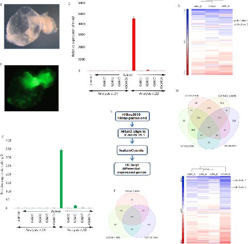 Fig. 1. Activin-induced cardiac explants as cardiogenic assay to screen for genes specifically regulated by cardiogenic gata genes. Activin-injected animal caps from myl2-GFP reporter Xenopus laevis transgenic line were cultured until stage 45 and photographed in bright field (A) or with GFP filter (B) allowing visualisation of myl2-expressing cells throughout the beating explant. Total RNA was extracted from stage 32 wild-type Xenopus laevis explants injected with either Activin (Act) alone or together with gata4, 5 or 6 morpholinos (MOs) for real-time RT-PCR monitoring of myl2 (C) or tnni3 (D) expression. Following validation, samples were subjected to high-throughput sequencing where (E) represents schematic pipeline of RNA-seq bioinformatics analysis and (F, H) Venn diagrams of numbers of genes that are differentially expressed compared to Activin-injected control with at least a two-fold reduction in expression and an adjusted p value of<0.05. (G, I) Heatmaps of fold changes for differentially expressed genes (increased or decreased expression without any fold-change threshold applied) highlighting sub-clusters that are specifically regulated by gata4. Abbreviations: control, uninjected explant; G4MO, G5MO, G6MO and 456MOs representing respectively gata4, gata5, gata6 and all three combined morpholinos. Genes in sub-clusters 1 and 2 are listed in Fig. S1B, C. |
