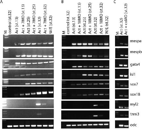 Fig. 2. sox7 and sox18 are required for Activin-induced cardiac differentiation. Semi-quantitative RT-PCR assay monitoring cardiogenic gene expression (as indicated) in animal cap explants injected with Activin alone or in combination with sox7 and sox18 MOs, analysed at control stages 13, 25 and 32. Note that pronounced sox7 and sox18 expression starts after expression of cardiac progenitor markers mespa, mespb, and the early cardiac marker gata4. Note also that MO-mediated knockdown of sox7 or sox18 affect cardiac differentiation, as monitored by induction of cardiac differentiation markers myl2 and tnni3. M, Molecular size marker; control, uninjected explant; CoMO, control MO; 7MO, sox7 MO; 18MO, sox18MO; W/E, whole embryo; odc, ornithine decarboxylase (internal loading control). |