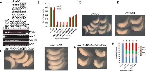 Fig. 3. sox7 and sox18 are required downstream of gata4 for cardiac differentiation. Semi-quantitative (A, B, D, F and H) and quantitative RT-PCR (C, E, G and I) assay monitoring cardiac differentiation marker gene expression in control stage 32 explants. Explants injected with 1000 pg of mRNA encoding dexamethasone-inducible gata4 (G4GR), gata5 (G5GR) and gata6 (G6GR) (A, B and C); or Activin-induced cardiac explants in the presence of control, sox7, sox18 or both SoxF MOs with mRNA encoding dexamethasone-inducible gata4, 5, 6 (D to I). Note that gata4, 5 and 6 induce cardiac differentiation to a different extent (A). Note also that both sox7 and sox18 MOs result in reduced induction of cardiac differentiation markers (myl2, tnni3) (B to I and that this cannot be recovered by overexpression of either gata4 or the other paralogs gata5 or 6 (D to I)). Note further that simultaneous knock down of sox7 and sox18 essentially abolishes expression of cardiac differentiation markers (B, C, F and G) and that neither sox7 nor sox18 is required for their own or each other's expression (D, F). CoMO, control MO; 718MOs, sox7 and sox18 MOs; Dex, Dexamethasone added at control stage 8 apart H and I as indicated at stages 8 and 13. Other abbreviations are as in Fig. 2. |