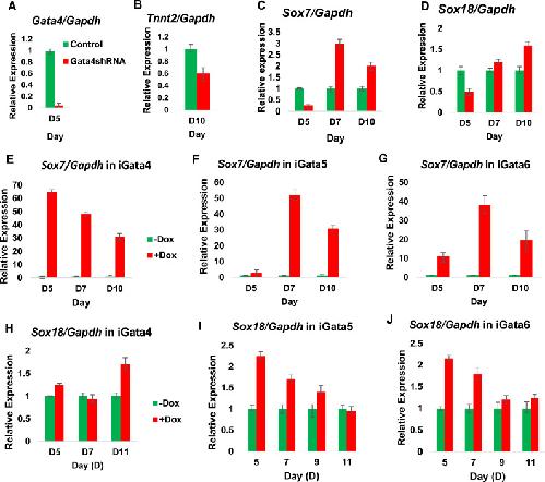 Fig. 6. Sox7 is required during mouse ES cell differentiation into cardiomyocytes (A) RT-qPCR analysis of Gata4 expression at day 5 (D5) of cardiomyocyte differentiation. Gata4 expression was significantly decreased in cells transfected with Gata4 shRNA compared to control cells. (B) Tnnt2 expression was decreased at D10 in Gata4 knockdown cells compared to untransfected controls. (C) Sox7 expression during cardiomyocyte differentiation. At D5, Sox7 expression was reduced in cells transfected with Gata4 shRNA compared to controls, though at subsequent stages expression was increased. (D) Sox18 expression was also reduced at D5 in cells transfected with Gata4 shRNA compared to untransfected controls, whereas expression was increased during later stages of differentiation. (E) RT-qPCR analysis of Sox7 expression in inducible Gata4 (iGata4) mouse ES cells. Following doxycycline (+dox) induction at D4, Sox7 was rapidly upregulated at D5 compared to control (-dox). (F and G) RT-qPCR analysis of Sox7 expression in iGata5 and iGata6 cells. Sox7 expression was only moderately increased at D5 in induced cells compared to iGata4 (E). Sox7 expression was later increased at D7 and D10 compared to controls. (H) RT-qPCR analysis of Sox18 in iGata4 cells. Sox18 expression was only slightly increased at D5 following doxycycline induction at D4, compared to uninduced controls. (I and J) RT-qPCR analysis of Sox18 expression in iGata5 and iGata6 cells. Sox18 expression was increased at D5 following doxycycline induction at D4 in iGata5 and iGata6 cells, compared to uninduced controls. |
