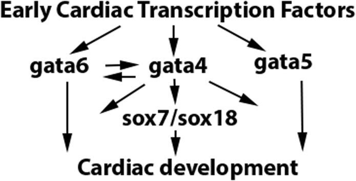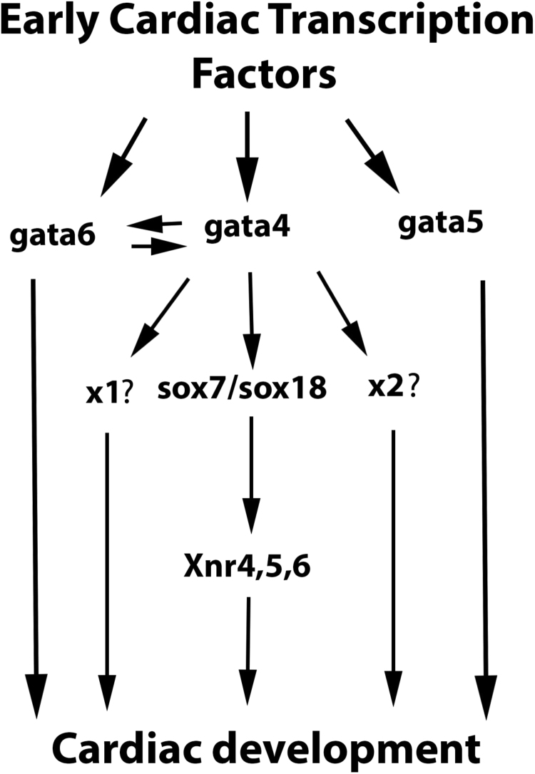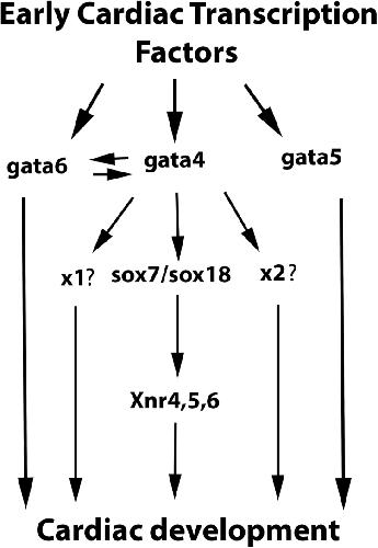 Fig. 7. Proposed model to depict the functional differences between cardiogenic gata paralogs during cardiomyogenesis. The SoxF paralogs sox7 and sox18 mediate gata4 but not gata5 and gata6 function during cardiomyogenesis. All cardiogenic gata function after induction of early cardiac transcription factors where sox7 and sox18 act downstream to mediate only some of gata4 but not gata5 and gata6 function during cardiomyogenesis (for details, see text in Discussion Sections). ×1? and ×2? indicate yet unidentified intermediary factors. |