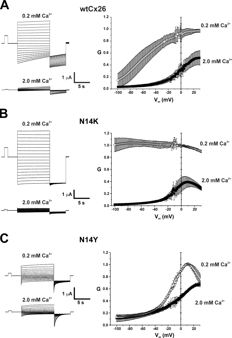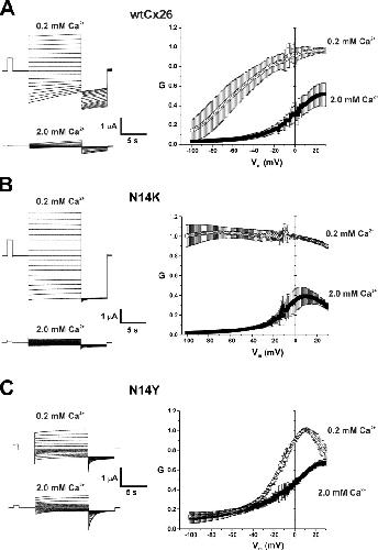 Figure 2. N14K and N14Y mutations produce differential shifts in voltage-dependent loop gating. Shown are representative families of currents from WT Cx26, N14K, and N14Y hemichannels at two different external Ca2+ concentrations, 0.2 mM and 2 mM. Currents were elicited using a voltage step protocol consisting of 10-s steps, from 60 to â110 mV in intervals of 10 mV, followed by a 5-s step to â110 mV; oocytes were voltage clamped to â20 mV between steps. Accompanying these currents are normalized G-V relationships at 0.2 mM and 2 mM Ca2+. Data were obtained by applying slow (600 s) voltage ramps from 40 to â100 mV from a holding potential of â20 mV. Ramps were applied to each oocyte in 0.2 and 2.0 mM Ca2+, and the calculated conductances were normalized to the maximum value measured in 0.2 mM Ca2+. N14K continued to show robust inhibition by Ca2+, but conductance remained essentially constant with hyperpolarization in 0.2 mM Ca2+. The G-V relationship for N14Y in 0.2 mM Ca2+ was shifted substantially positive along the voltage axis compared with WT Cx26, and Ca2+ appears to have a relatively modest effect. Each symbol represents the mean value. Error bars are ±SEM. WT Cx26, n = 5; N14K, n = 5; N14Y, n = 4. |