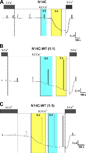 Figure 8. Substituted cysteine accessibility supports exposure of N14 to the aqueous pore. (AâC) Shown are effects of MTSEA and MTSET on macroscopic currents recorded from oocytes expressing N14C alone (A) or co-injected with WT Cx26 (B and C). Oocytes were bathed in a simple 100 mM NaCl salt solution containing the indicated Ca2+ concentrations and held at â40 mV throughout except for periodic steps to 40 mV to assess hemichannel activation at a positive voltage. (A) Responses of N14C to MTSET and MTSES. Bath application of MTSET showed little or no effect, whereas subsequent application of MTSEA produced a large induction of current. (B) The same experiment as in A, except it was performed in a cell co-injected with N14C and WT Cx26 in a 1:1 ratio. Bath application of MTSET induced an increase in current, and the subsequent action of MTSEA was attenuated. (C) In a cell co-injected with N14C and WT Cx26 in a 1:1 ratio, bath application of MTSEA induced a large current that occluded the subsequent action of MTSET, indicating that the same site is modified by both reagents and that MTSEA modifies all available sites. MTS reagents are designated as ET for MTSET and EA for MTSEA. |