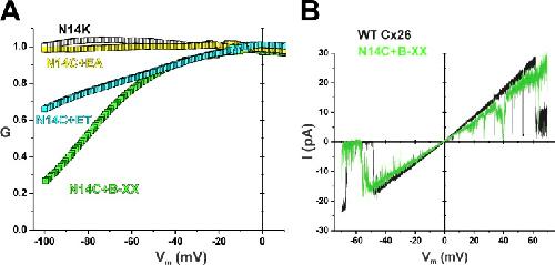 Syndromic deafness mutations at Asn 14 differentially alter the open stability of Cx26 hemichannels.