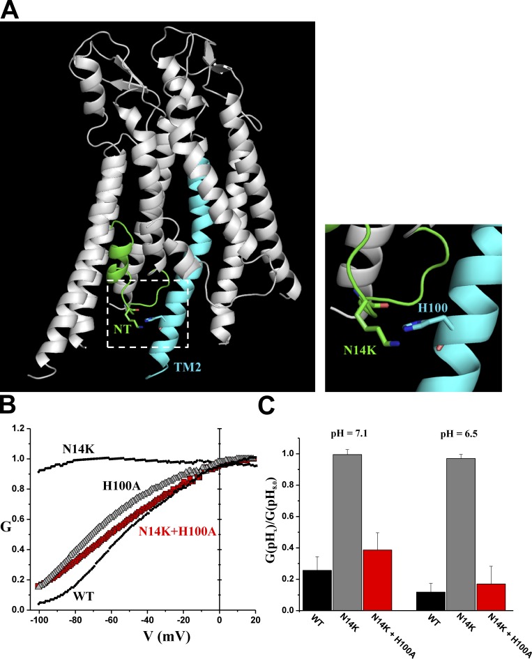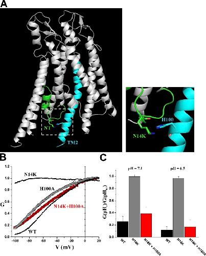 Figure 11. The double mutant N14K + H100A reverses the gating and pH phenotypes caused by N14K. (A) Representation of two adjacent hemichannel subunits from the atomic structure of Cx26 (Protein Data Bank accession no. 2ZW3; Maeda et al., 2009). The structure is displayed using the PyMOL Molecular Graphics System. The N terminus (NT) of one subunit (green) comes into close proximity to the cytoplasmic extension of the TM2 domain of an adjacent subunit (cyan). The N14K mutated residue in the N terminus is shown in close association with H100 in TM2 (inset shows an expanded view). The position of the mutated residue lysine at position 14 was selected from a set of backbone-dependent rotamers. (B) Superimposed normalized G-V relationships of N14K and WT Cx26 are shown (black) together with the double mutant N14K + H100A (red symbols) and H100A (open symbols) alone. The double N14K + H100A mutation resembles WT Cx26, suggesting that N14K and H100 may interact to stabilize opening in N14K hemichannels, making them refractory to gating upon hyperpolarization. Recordings were performed in 0.2 mM Ca2+. G-V relationships were obtained by applying slow (600 s) voltage ramps between 40 and â100 mV from a holding potential of â20 mV. Each point is the mean conductance. Error bars were omitted for clarity. H100A, n = 4; N14K + 100A, n = 7. Data for N14K and WT are the same as in Fig. 2. (C) The loss of sensitivity to pH caused by the N14K mutation is also reversed in the double N14K + H100A mutant. Bar graph comparing pH responses of WT Cx26, N14K, and N14K + H100A hemichannels. Shown are data for pH 7.1 and 6.5 plotted as the ratios of the macroscopic conductances at each of these two pH values relative to pH 8.0. Conductance was calculated from oocytes held at â40 mV. Each bar represents the mean ratio ± SEM. N14K + H100A, n = 10. Data for WT Cx26 and N14K are the same as in Fig. 6. |