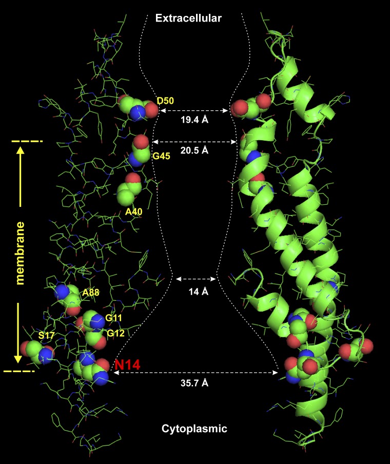 Figure 7. Positions of N14 and other KID mutants in the Cx26 structure. Representation of two of six subunits (in green) around a central aqueous pore from the atomic structure of Cx26 (Protein Data Bank accession no. 2ZW3; Maeda et al., 2009). The structure is displayed using the PyMOL Molecular Graphics System (version 1.8; Schrödinger, LLC). For clarity, the Cx26 sequence shown is truncated at residue G109 near the border of the cytoplasmic TM2 extension and the cytoplasmic loop. KID mutant residues are shown as spherical renditions. The gross shape of the pore is illustrated by the dashed lines, with approximate dimensions of the pore diameter at various positions. The approximate membrane boundary is indicated. In this structure, N14 is situated in the wide cytoplasmic vestibule of the hemichannel. |