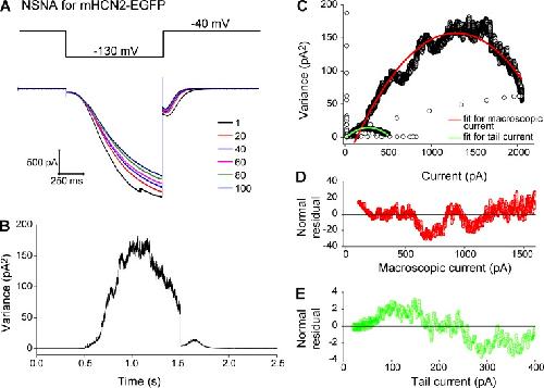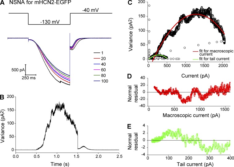 Figure 4. NSNA of macroscopic mHCN2-EGFP currents. (A, top) Voltage protocol used for channel activation and deactivation. (bottom) 6 representative traces from 100 repeatedly collected traces. (B) Current variance over the complete time course of a single episode. (C) Current variance versus mean current amplitude. Red, parabola fit of the macroscopic current part. Green, parabola fit of the tail current part. (D) Normal residual after curve fit for macroscopic current (corresponding to the red trace in C). Results: single-channel current, â0.298 pA (â130 mV); single-channel conductance, 2.29 pS; total number of channels, 8,715; Po, 75.5%. Adjusted R2, 0.934. (E) Normal residual after curve fit for tail current (corresponding to the green trace in C). Results: single-channel current, â0.114 pA (â40 mV); single-channel conductance, 2.86 pS; total number of channels, 4,707; Po, 88.4%. Adjusted R2, 0.963.