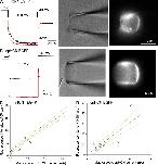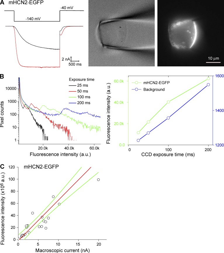 Figure 2. PCF recordings of the mHCN2-EGFP channel and cross-plots of fluorescence intensity versus current amplitude. (A, left) Macroscopic current recorded with 3 µM cAMP in the bath (red trace) and a voltage step from −40 to −140 mV. (right) The corresponding brightfield and fluorescence images. (B, left) Histogram of the pixel intensities of the whole image collected with four different exposure durations. Notice longer exposure durations, 100 and 200 ms, lead to saturated pixels. (right) Total fluorescence intensity from the membrane patch (green) and the background (blue). (C) Cross-plots of fluorescence intensity versus current amplitude. Linear fit statistics: Pearson correlation coefficient, 0.907. Green curves show the confidence bands (95%).