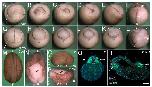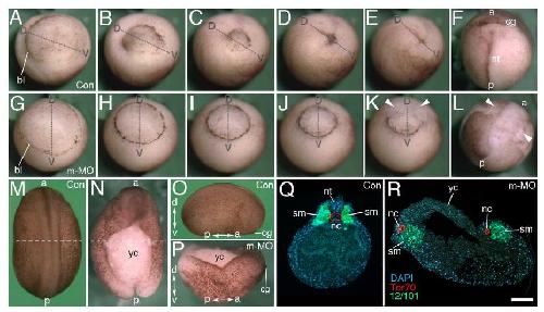 Fig. 1. Maternal Mov10 is required for gastrulation and neural tube formation. A–F: Successive time-lapse images of whole-mount control embryo undergoing normal gastrulation. G–L: Successive time-lapse images of whole-mount maternal Mov10 knockdown (m-MO) embryo that fails to complete gastrulation. Dorsal–ventral and anterior–posterior axes are as labeled. White arrowheads in K and L point to yolky debris and loose cells of the blastopore and dorsal lip. M–P: Dorsal, whole-mount images from Con and m-MO injected embryos. M: dorsal view of stage 21 control embryo. N: Dorsal view of sibling m-MO injected embryo. Note large opening with exposed yolky mass of cells on the dorsal surface. The loose yolky debris has washed away from this hatched embryo. O: Lateral view of a Con embryo like that shown in M. P: Dorsal view from anterior end of m-MO injected embryo showing the boat-shaped phenotype. The dotted lines in M and N show the plane of sections for Q and R, respectively. Q: Section through a stage 21 control embryo showing a single notochord and two rows of somites united along the dorsal midline. Antibody to Tor70 recognizes notochord cells (in red); Antibody 12/101 recognizes somitic mesoderm (in green); DAPI in blue. R: Section through a typical m-MO embryo showing failure to complete gastrulation and neurulation. This embryo has two separated files of notochord and somitic mesoderm. The dorsal side is located toward the top in Q and R. a, anterior; bl, blastopore lip; cg, cement gland; d, dorsal; nt, neural tube; nc, notochord; nt, neural tube; p, posterior; sm, somite; v, ventral; yc, yolk cells. Scale bar in R equals 120 mm (for A–L), 450 mm (for M,N), 440 mm (for O,P), and 80 mm (for Q,R). |