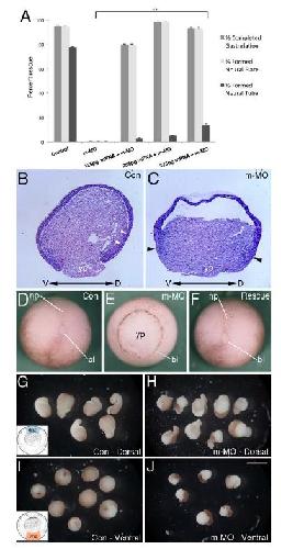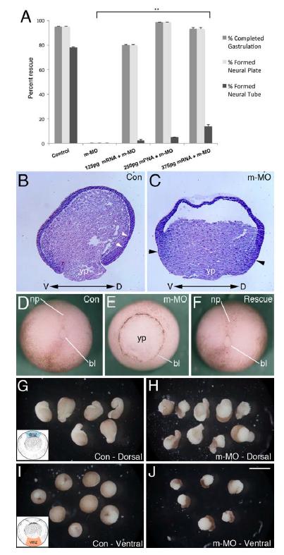 Fig. 2. mRNA rescue and MO effects on convergent extension. A: Partial rescue of m-MO phenotype by introduction of Mov10 mRNA. Error bars represent SEM, **P<0.01 (Studentâs t-test, two-tailed). Mov10 mRNA rescued cases that underwent gastrulation also formed a neural plate, but those cases typically disintegrate a few hours later so they are unable to complete neurulation and form a neural tube. B,C: X. laevis stage 10 sagittal sections stained with Hematoxylin and Eosin. Dorsal (D) and ventral (V) sides are as noted. B: Representative section of a Con embryo, showing Brachetâs cleft (white arrowheads), which separates the outer ectoderm from the underlying mesendoderm. C: Representative section of a sibling m-MO injected embryo, which lacks a visible delineation between ectodermal and mesendodermal layers (Brachetâs cleft). Note that cells along the dorsal and ventral sides of the blastopore and yolk plug, denoted with black arrowheads, appear to be thicker, having mainly undergone convergent thickening (compare B to C). D: Whole-mount image of representative stage 13â 14 Con embryo with closed blastopore. E: Representative sibling m- MO embryo with unclosed blastopore. F: Rescued embryo co-injected with m-MO and Mov10 mRNA (250 pg) with closed blastopore. GâJ: Development of stage 10 dorsal (dmz) and ventral marginal zone (vmz) explants harvested from the region shown in the inset included in G and I, respectively. G: Control dmz explants eventually form mesoderm that undergoes convergent extension, as revealed by the formation of elongated projections. H: dmz explants from m-MO injected embryos also show signs of convergent extension and elongation. Note, however, that the pigmented ectoderm does not cover the mesodermal tissue as completely as seen in control explants (compare with G). I: vmz explants harvested from stage 10 control embryos do not exhibit signs of elongation and form spherical embryoids. J: Likewise, m-MO injected embryos also form spherical embryoids. Note that the pigmented ectoderm has not covered the surface of these explants. bl, lip of blastopore; np, neural plate; yp, yolk plug. Scale bar=180 mm in J (applies in B,C: 250 mm for DâF, 850 mm for GâJ. |