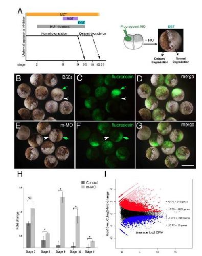 Fig. 3. Mov10 regulates MZT through RISC. A: Schematic of developmental time periods and the HU assay. The MZT spans between stage 1 and stage 10. The MBT lies between stages 8 to 9. EGT occurs between stage 9 to 9.5. HU treatments lasted from the two-cell stage to stage 9.5. At the two-cell stage one of the blastomeres was injected with fluorescein-tagged morpholinos and the embryos were treated with HU until stage 9.5. BâD: Images of stage 9.5 embryos, where one cell had been injected with morpholino, targeting a positive regulator of MZT (B56e) at the 20-cell stage. A total of 22 embryos were injected, and 21 of those showed the expected phenotype. Green arrows point to the live progeny of the injected cell in one of the cases shown. White arrowheads point to the dead progeny of the uninjected cell. EâG: Images of stage 9.5 embryos, where only one cell was injected with m-MO. A total of 22 embryos were injected and all of them showed the expected phenotype. H: qRT-PCR of cyclin A1 levels in control and m-MO embryos at indicated stages. Error bars represent SEM. NS- Not significant, *P<0.05 (Studentâs t-test, two-tailed). I: Differential expression results for maternal Mov10 morpholino (m-MO) injected (Mov10) vs. control embryos (C), X-axisaverage expression value (TMM-normalized Counts Per Million, log2 scale) of each X. laevis gene and y-axis is log2 (Mov10/C). Each point is a single gene: groups of genes colored red or blue had significantly greater than or less than 1.5 FC difference (unlogged), respectively. Groups of genes colored pink or light blue also had significantly greater than or less than 10 FC difference (unlogged), respectively. The numbers of genes listed at the +/- 1.5 FC level include the genes with610 FC. Scale bar in G equals 100 mm for A an 300 mm for BâG. Gene identities and statistical analysis are in Supplementary Table S2 (accessible through NCBI GEO accession number GSE86382) |