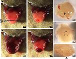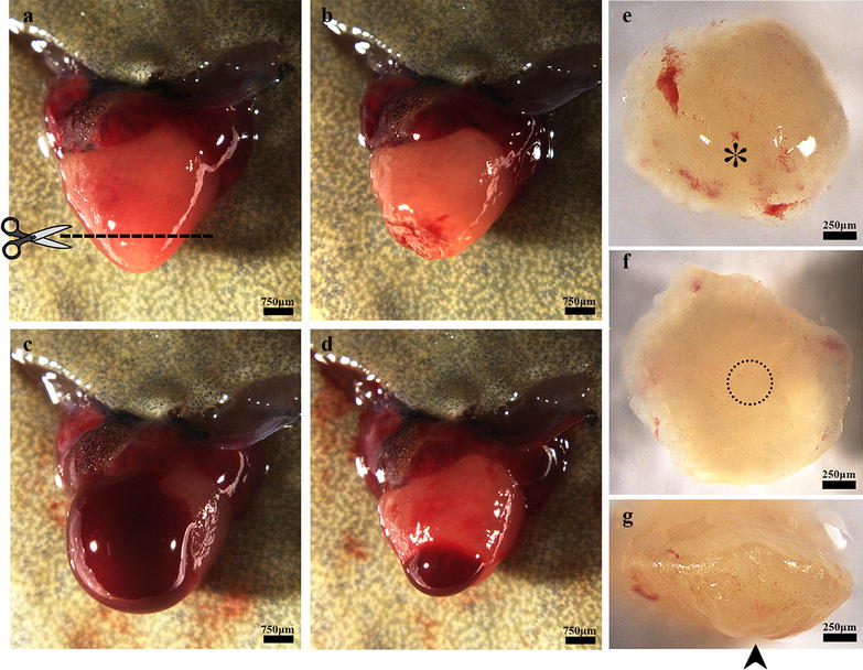 Fig. 1. Apical resection of the X. tropicalis heart and rapid blood coagulation after resection. a The heart was exposed for apical resection. The dash line shows the resection plane, corresponding to approximately 10% of the ventricle. b The heart immediate after surgical amputation. c Bleeding after ventricle amputation. d Rapid blood coagulation in the amputated heart after approximately 5 s of pressure with sterile cotton. e Outer surface of the amputated apex. The asterisk indicates the end of the apex on the outer surface. f Inner surface of the amputated apex. The circle with the dotted line indicates the bottom of the ventricle. g Lateral view of the amputated apex. The arrow indicates the bottom of the apex on the outer surface