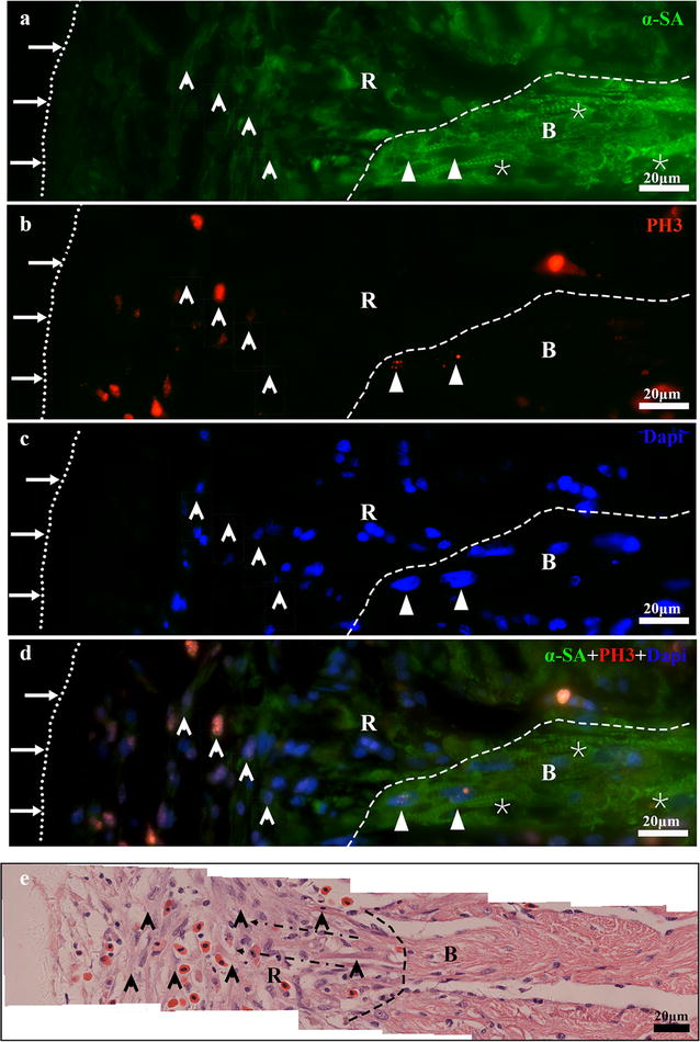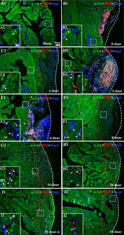 Fig. 5. α-SA/PH3 positive cells exist in the border area of the amputated site and regenerated area. a1 Longitudinal section of the apical area from a sham control. High magnification of the square region is shown (a2). Longitudinal sections of an amputated heart at 0 daar (b1, b2), 1 daar (c1, c2), 2 daar (d1, d2), 4 daar (e1, e2), 8 daar (f1, f2), 16 daar (g1, g2), 30 daar (h1, h2; perfect regeneration), 30 daar (i1, i2; nearly perfect regeneration), and 60 daar (j1; perfect regeneration). The amputated apex was regenerated by newly cardiomyocytes within approximately 30 days after amputation, as demonstrated by the presence of many α-SA+ cardiomyocytes in the regenerated zone (area between the red dotted line and white dotted line). In addition, the density of α-SA+/PH3+ cardiac myocytes in the border area of the regenerated zone at 2â8 daar and in the regenerated zone at 16â30 daar is significantly higher than those in the sham control and in 0â2 daar groups, suggesting that the proliferation of endogenous cardiomyocytes in the border area of the amputated site might be an important mechanism for regeneration of the damaged myocardium. α-SA alpha skeletal muscle actin, PH3 phospho-histone H3, DAPI 4â²,6-diamidino-2-phenylindole. White arrow: PH3+ nucleus. White dotted line, outer surface of the epicardium. Area between the red dotted line and white dotted line, regenerated area after amputation. 30-daar-n: amputated heart with nearly perfect regeneration at 30 daar. Bar in a1âj1 = 50 μm. Bar in a2âj2 = 10 μm. Six frogs were inspected for 30 and 60 daar, while three frogs were inspected for other time points respectively