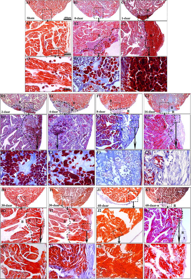 Fig. 3. Adult X. tropicalis heart has capacity for regeneration after resection. A1 Longitudinal section of an adult heart from the non-amputated sham control. Bar = 400 μm. A2 High magnification of the region outlined by rectangle in A1. Bar = 100 μm. A3 High magnification of the rectangle region in A2. Bar = 20 μm. B1âB3 An amputated heart at 0 daar (approximately 30 min after amputation), showing activated inflammation and hyperemia at the border of the injury. C1âC3 An amputated heart at 1 daar, showing a membrane-like structure (arrow) close to the outer surface of the scar tissue which exhibited with inflammatory cell infiltration, and red blood cells accumulation below the membrane-like structure. C2â² High power of the membrane-like structure which is consisted of cellular or some extracellular matrix. D1âD3 An amputated heart at 2 daar, showing more inflammatory cells in the regenerated area compared with 1 daar. E1âE3 An amputated heart at 4 daar, showing an increase of inflammatory cells and a decrease of red blood cells in the regenerated area compared with 2 daar. F1âF3 An amputated heart at 8 daar, showing the disappearance of most infiltrated red blood cells and a significant decrease of the inflammatory cell intensity in the regenerated area. g1âg3 Most of the fibrous tissue production was replaced with newly regenerated cardiomyocytes and some of the newly regenerated cardiac myocytes are matured, as indicated by a more regular cardiac-specific cross-striated morphology at 16 daar (G3â²). H1âH3, I1âI3 An amputated heart regenerated with a perfect morphology and nearly perfect morphology at 30 daar. The amputated area was regenerated with mature cardiomyocytes. In addition, the regenerated myocardium has an intact epicardium (arrow). J1âJ3, K1âK3 An amputated heart regenerated with a perfect morphology and nearly perfect morphology at 60 daar. The amputated area was regenerated with mature cardiomyocytes. An intact epicardial structure (arrow) in the regenerated myocardium. R regenerated area, B border area. White star: showing red blood cells; White arrows: showing inflammation cells. Six frogs were inspected for 30 and 60 daar, while three frogs were inspected for other time points respectively