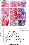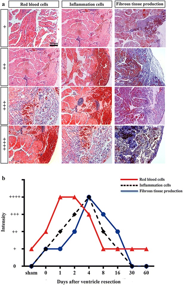 Fig. 8. Time course of infiltration of red blood cell and inflammation, and fibrosis during the regeneration of amputated myocardium. a Images represent various degrees of infiltration of red blood cell and inflammation cells, and fibrous tissue production during heart regeneration. b Comparison of time courses for infiltration of red blood cell and inflammation cells, and fibrous tissue production