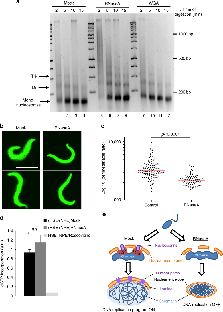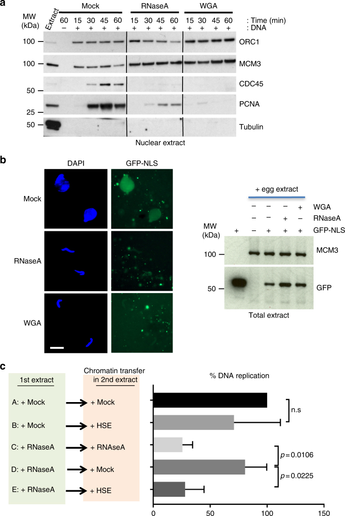 Upon fertilisation, the sperm pronucleus acquires the competence to replicate the genome through a cascade of events that link chromatin remodelling to nuclear envelope formation. The factors involved have been partially identified and are poorly characterised. Here, using Xenopus laevis egg extracts we show that RNAs are required for proper nuclear envelope assembly following sperm DNA decondensation. Although chromatin remodelling and pre-replication complex formation occur normally, RNA-depleted extracts show a defect in pre-RC activation. The nuclear processes affected by RNA-depletion included ELYS recruitment, which accounts for the deficiency in nuclear pore complex assembly. This results in failure in chromatin relaxation as well as in the import and proper nuclear concentration of the S-phase kinases necessary for DNA replication activation. Our results highlight a translation-independent RNA function necessary for the parental genome progression towards the early embryonic cell cycle programme.