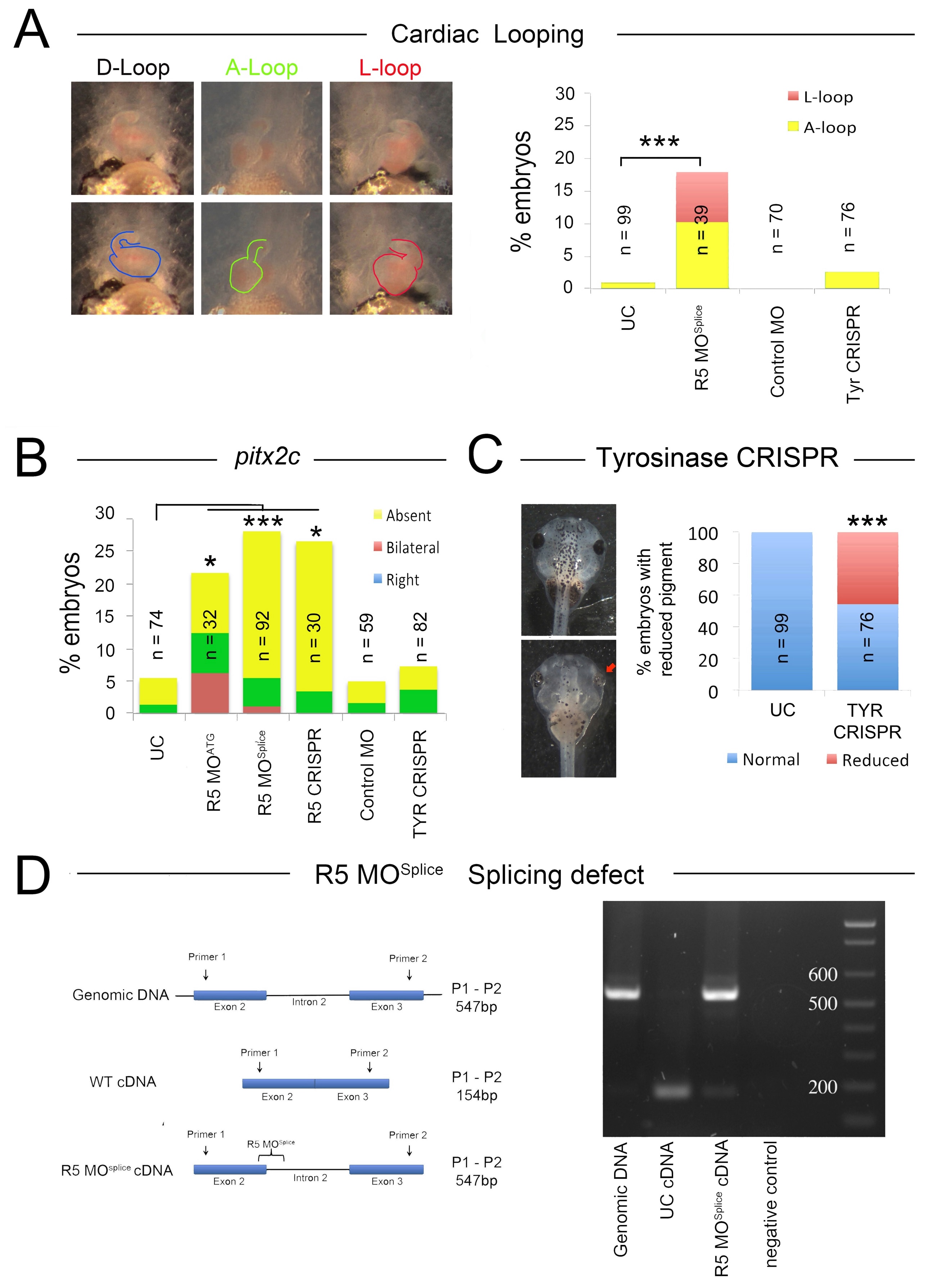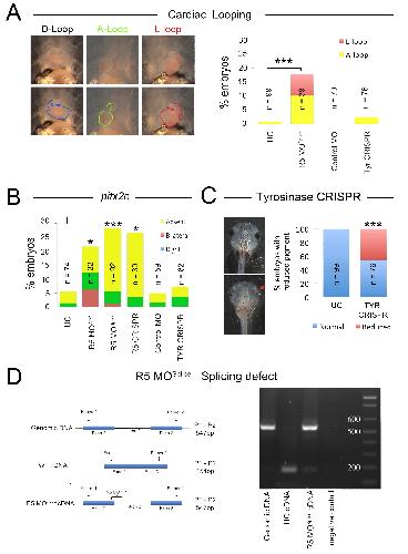 Figure S1. Related to Fig. 1; Depletion of Rapgef5. (A) Knockdown of Rapgef5 disrupts cardiac looping. Ventral views of Xenopus tadpoles with anterior to the top. Representative examples of a normal (D-loop outlined in blue lower panel), and abnormal (A-Loop outlined in green, L-Loop outlined in red) looped heart. Injection of a control MO or a control CRISPR (targeting tyrosinase) does not affect cardiac looping. (B) Injection of a control MO or control CRISPR (targeting tyrosinase) does not cause abnormalities in pitx2c expression. (C) The control (tyrosinase) CRISPR reduces pigment levels in stage 45 Xenopus embryos, demonstrating that the CRISPR/CAS9 system functions as expected. (D) Rationale of R5 MOSplice design. The splice MO targets the splice donor site at the start of intron 2. Failure to excise intron 2 results in a premature stop codon early in the Rapgef5 protein. RT-PCR confirms that R5 MOSplice causes retention of intron 2. In genomic DNA, intron 2 spanning primers amplify a band of 547bp. In WT cDNA, these primers amplify a band of 157bp. PCR primers amplifying cDNA from R5 MOSplice morphants generate a band at 547bp indicating retention of intron 2 in mRNA. A âno templateâ negative control is also included. A single asterisk indicates P<0.05 and a triple asterisk P<0.005. |