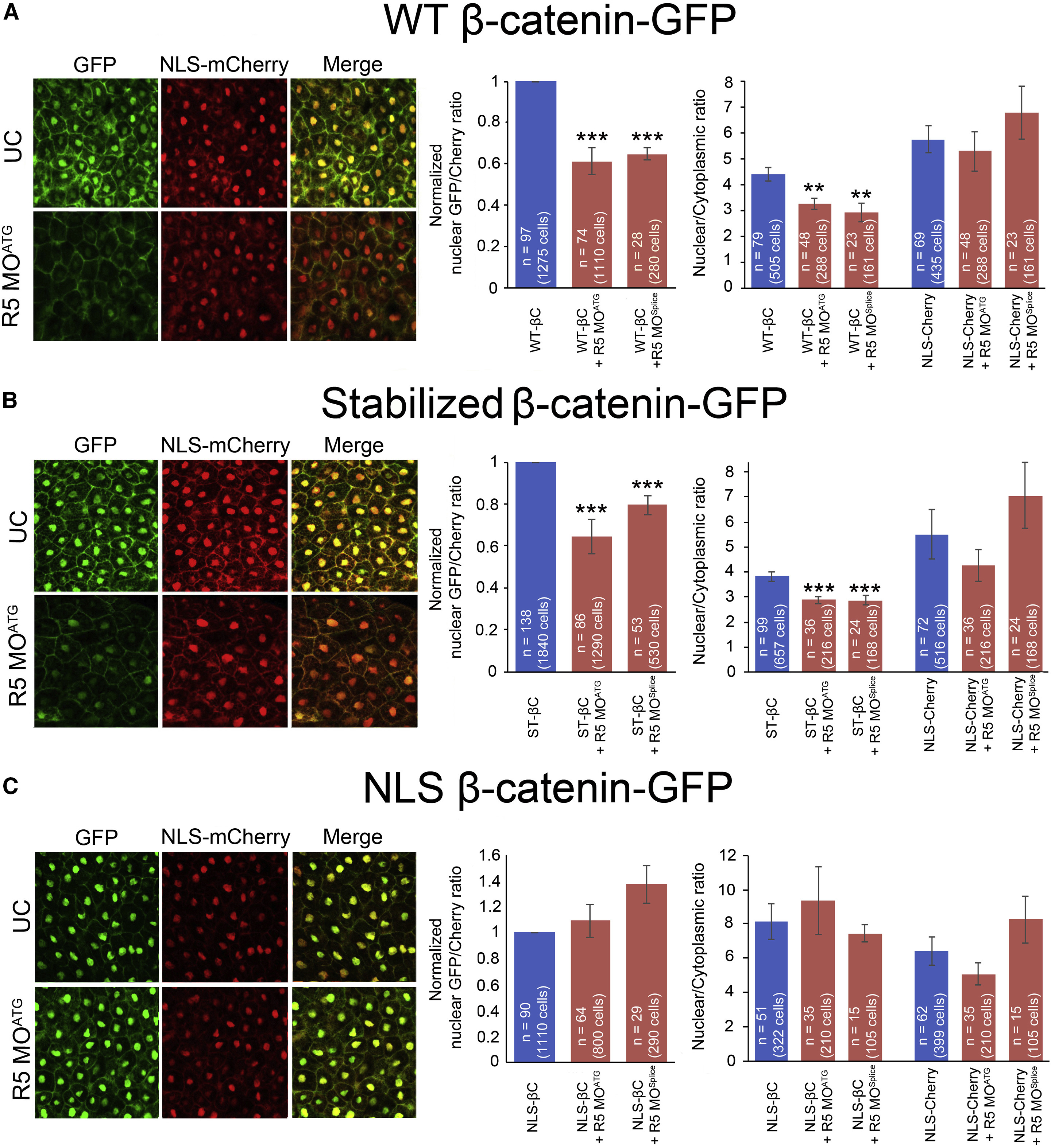 Figure 4. Rapgef5 Is Required for the Nuclear Localization of β-Catenin (A and B) GFP-tagged WT and ST β-catenin localize to the plasma membrane and nucleus in the dorsal blastopore lip of stage 10 control embryos but this nuclear localization is lost in rapgef5 morphants (note loss of nuclear GFP signal in merged images). (C) NLS β-catenin-GFP localizes normally into nuclei even in the absence of Rapgef5. Graphs in the center panel represent the ratio of nuclear-localized GFP relative to nuclear-localized NLS-cherry control. Controls were normalized to ease comparison. The graphs on the right display ratiometric analysis of nuclear versus cytoplasmic GFP (β-catenin) and NLS-mCherry levels. Nuclear-localized β-catenin is reduced in Rapgef5 morphants relative to controls for WT and ST β-catenin, but not NLS-β-catenin. Localization of NLS-mCherry is unaltered. All data represented as mean ± SE. ââp < 0.01, âââp < 0.005. |