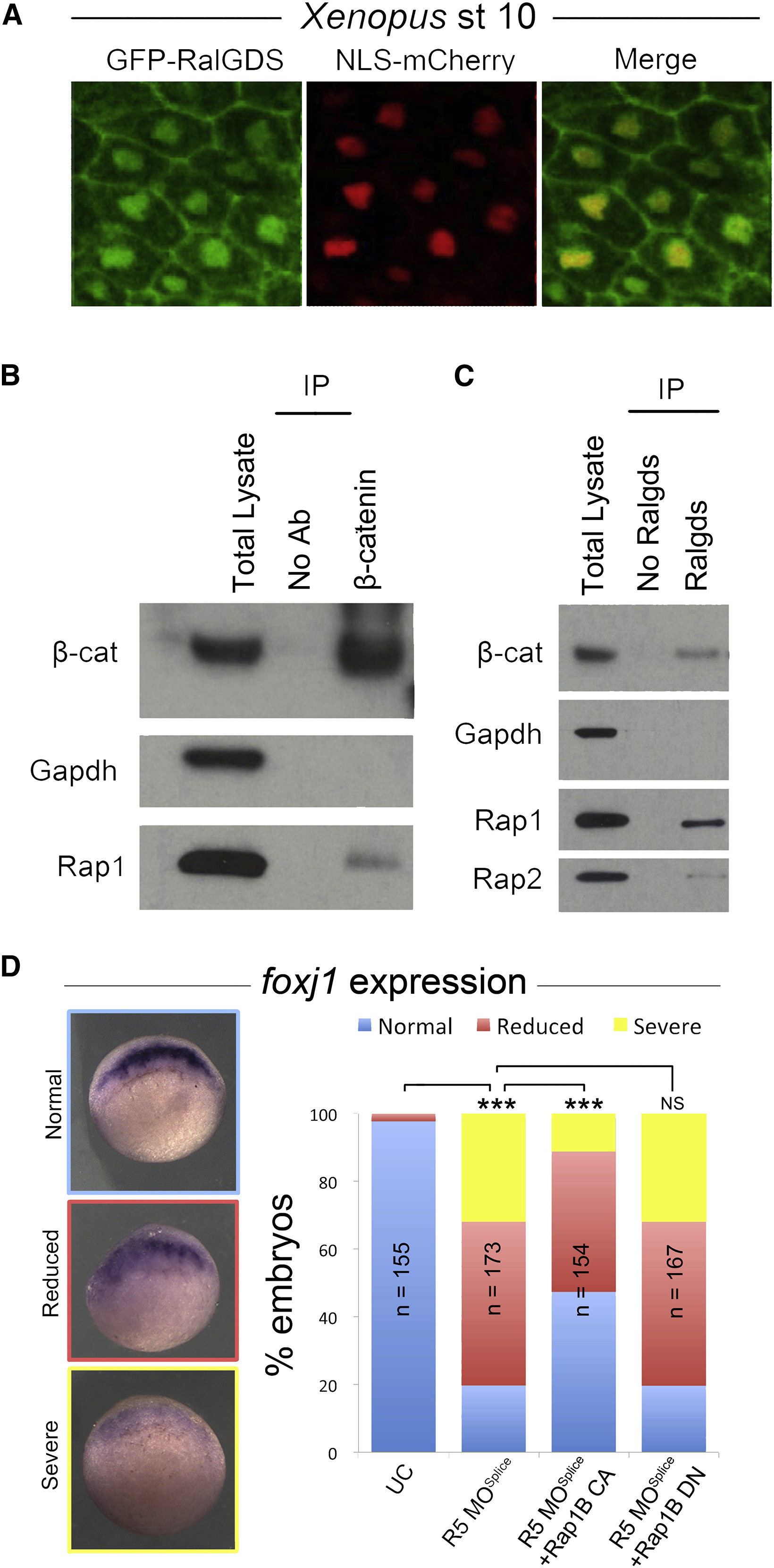 Figure 7. Active Raps and β-Catenin Interact (A) The GFP-RBDRalGDS active Rap sensor reveals the presence of active Raps in the nucleus and plasma membrane of dorsal blastopore lip cells at stage 10. (B) Rap1 protein co-immunoprecipitates with β-catenin. IP, immunoprecipitate. (C) Pull-down of active Rap proteins from stage 10 Xenopus embryos using the RalGDS sensor. β-Catenin co-immunoprecipitates with active Raps demonstrating an interaction. (D) Injection of CA Rap1b mRNA can partially rescue loss of foxj1 expression in rapgef5 morphants, while DN Rap1b mRNA does not. âââp < 0.0001. See also Figure S7. |