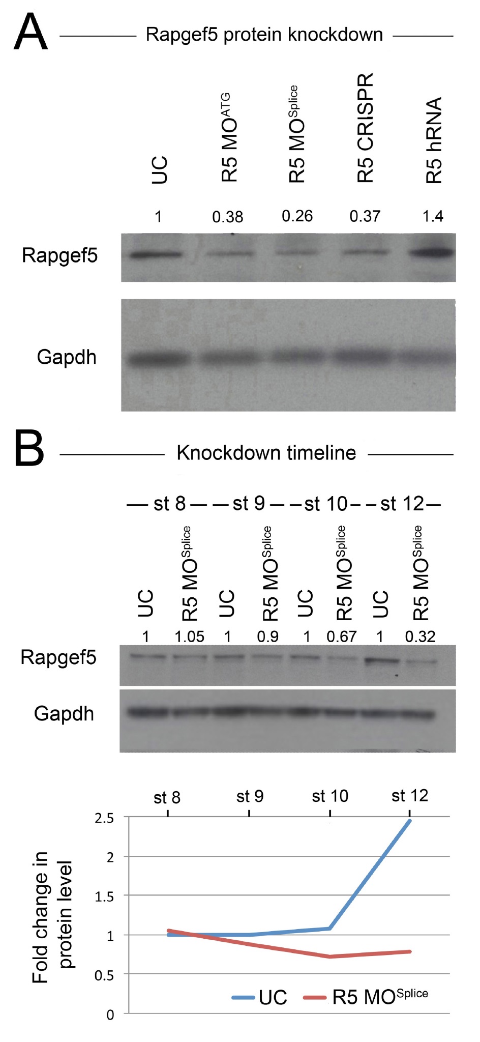 Figure S2. Related to Fig. 1; Depletion of Rapgef5 protein. (A) Western blot demonstrating the efficacy of the R5 MOATG, R5 MOSplice, and CRISPR mediated Rapgef5 depletion in stage 10 Xenopus embryos. Overexpression of human RAPGEF5 mRNA increases protein levels. (B) Timeline of Rapgef5 depletion. Rapgef5 protein levels were unaltered in morphants at late blastula stages (st 8 and 9) but reduced at stage 10 and 12. The graph represents fold changes in Rapgef5 protein levels in control and depleted embryos relative to the stage 8 uninjected controls. |