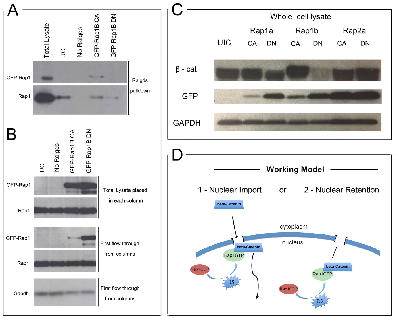 Figure S7. Related to Fig. 7; A Rap1 mediated transport system. (A) Validation of the CA (constitutively active) and DN (dominant negative) Rap1 constructs. RBDRalGDS selectively pulls down endogenous active RAPs, as well as the GFP tagged CA, but not the DN Rap1b mutant. (B) While the GFP tagged CA and DN Rap1 constructs can be equally detected in the total lysate, the level of the CA form is greatly reduced in the first flow through from the pull down columns, reflecting the binding of CA Rap1 to RBDRalGDS and its retention in the column. (C) Injection of CA Rap1a or Rap1b leads to an increase in total β-catenin protein levels relative to controls, while injection of the DN forms causes a decrease in total β-catenin levels. Injection of Rap2a CA or DN did not reveal a differential effect on β-catenin. (D) Proposed model for Rapgef5s role in nuclear localization of β-catenin. Rapgef5 maintains nuclear Raps in their active GTP bound confirmation, which is required for 1) â the nuclear import of β- catenin or 2) â retention of β-catenin within the nuclear compartment. |