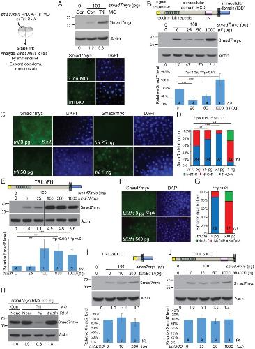 FIGURE 1: Structure–function analysis of Tril. (A) Embryos were injected with RNA (100 pg) encoding Smad7myc