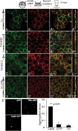 FIGURE 3:. The extracellular domain of Tril is required to retain it at the plasma membrane while the intracellular domain is required for internalization. (AâDâ´) RNAs encoding wild-type or deletion mutant forms of Tri-HA (illustrated to the left of each panel) and membrane-localized RFP (memRFP) were injected into a single animal pole blastomere of four-cell embryos. Ectoderm was explanted from 5â10 embryos in each group at stage 11 and immunostained for HA and RFP. (AâDâ³) Projections viewed from the xy-axis. (Aâ´âDâ´) Projections viewed from the z-axis. Results were replicated in three independent experiments. (E) CHO cells transfected with GFP (negative control), cadherin6-GFP (Cad6-GFP) (positive control), or Tril-GFP were tested for adhesion. Only cells expressing cadherin6 formed aggregates. The aggregation index was calculated by dividing the total GFP fluorescence in cell aggregates by the total GFP fluorescence in the well. Mean ± SD are shown, n = 3, ***p < 0.01 by two-tailed t test.