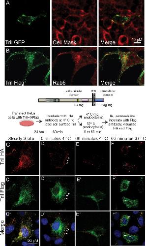 FIGURE 4:. Tril is retrieved from the cell surface into endosomes in HeLa cells. (A) HeLa cells were transiently transfected with DNA encoding human Tril-GFP. The plasma membrane was stained with CellMask 24 h later, and GFP was imaged in unfixed cells. (B) HeLa cells were transfected with DNA encoding human Tril-Flag. Cells were fixed 24 h later and double-label immunostained with antibodies specific for Flag and Rab. All results were replicated in three experiments. (CâF) Hela cells were transiently transfected with DNA encoding HA- and Flag-epitope tagged Xenopus Tril (illustrated above panels). Cells were either permeabilized and double-label immunostained with antibodies specific for both epitopes (CâCâ³) or were incubated at 4°C with anti-HA antibodies for 1 h and then either permeabilized immediately (DâDâ³) or incubated at 4°C (EâEâ³) or at 37°C (FâFâ³) for 1 h before permeabilization and addition of antibodies specific for the Flag tag. HA and Flag epitopes were visualized with species specific fluorescent secondary antibodies. The white arrowheads in DâDâ³ denote Tril present at the cell surface while the white arrows in FâFâ³ indicate Tril present in intracellular compartments. Results were replicated in three independent experiments.