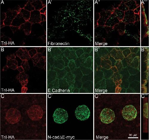FIGURE 5:. Cadherin-mediated cellâcell adhesion is required for cell surface retention of Tril in Xenopus explants. (AâDâ´) RNA encoding Tril-HA (100 pg) was injected into a single animal pole blastomere of four-cell embryos. Ectoderm was explanted from 5â10 embryos in each group at stage 11 and immunostained for HA and Fibronectin (AâAâ´) or E-cadherin (BâBâ´). (CâCâ´) RNA encoding Tri-HA (100 pg) and N-cadâEmyc was coinjected into a single animal pole blastomere of four-cell embryos. Ectoderm was explanted from 5â10 embryos in each group at stage 11 and immunostained for HA and myc. Results were replicated in three independent experiments. AâCâ³â³ show projections viewed from the xy-axis and Aâ´âDâ´ viewed from the z-axis.