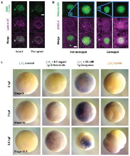 Extended Data Figure 2. Characterization of micronuclei in te×ls hybrid embryos and link to embryo deatha, Disrupted micronuclei envelopes in te×ls hybrid embryos. Whole mount embryo immunofluorescence was performed in te×ls hybrid embryos using the YO-PRO DNA dye (top) and anti-Lamin B1 antibody (middle), corresponding channels are shown in green and magenta, respectively. The merged images are shown below. 25 micronuclei within 5 different embryos were analyzed. Intact (left) and disrupted (right) envelopes were observed in all analyzed embryos. Scale bar is 10 μm. b, DNA damage in te×ls hybrid embryo micronuclei. Whole mount embryo immunofluorescence was performed in te×ls hybrid embryos using anti-histone H3 (top) and anti-γH2A.X (middle) antibodies, corresponding channels are shown in green and magenta, respectively. The merge images are shown below. 21 micronuclei within different 6 embryos were analyzed. Micronuclei with undamaged (left; negative γH2A.X signal) and damaged (right; positive γH2A.X signal) DNA were observed in all analyzed embryos. Zoomed images of micronuclei are shown on the right of each image. Scale bar is 10 μm. c, TUNEL assay in apoptotic X. tropicalis and te×ls hybrid embryos. X. tropicalis (left), X. tropicalis treated with cycloheximide (middle left) or hydroxyurea (middle right) as indicated, and te×ls hybrid (right) embryos were prepared for TUNEL assay 5 hpf (equivalent stage 9; top), 7 hpf (equivalent stage 10; middle) and 9.5 hpf (equivalent stage 10.5; bottom). Identical results were obtained over 3 different experiments. Representative images are shown and were taken under identical conditions. |