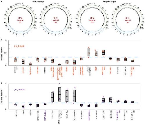 Extended Data Figure 3. Whole genome sequencing of tte×ls rescued embryos and metabolomic profiling of te×ls and te×bs hybrid embryosa, The genomes of 4 tte×ls rescued embryos were sequenced, aligned, and normalized to the genomes of X. tropicalis (blue) and X. laevis (green) for which sub-genomes S and L were distinguished (S in light green and L in dark green). Underrepresented regions of the genomes are color-coded in black. The tte×ls embryo genomes 1–2 were prepared from tailbuds, and 3–4 from tadpoles. b, Metabolites differentially represented between te×ls hybrid and X. tropicalis embryos 7 h post fertilization. Among the 179 metabolites detected, 17 were significantly altered in te×ls hybrid embryos (p < 0.05; two-tailed homoscedastic t-test; individual p-values are provided in Figure 3c source data) and are shown as a ratio to the X. tropicalis control (blue dashed line). Levels were obtained from 5 samples from 3 independent fertilizations each. Values for the te×ls hybrid are plotted in orange. The averages are shown as thick lines and the gray boxes correspond to 1 standard deviation. 95% confidence intervals are, from left to right, 0.69±0.24, 0.46±0.26, 0.16±0.16, 0.68±0.18, 0.70±0.21, 0.58±0.25, 0.10±0.09, 0.42±0.19, 0.38±0.27, 0.79±0.15, 1.61±0.61, 1.47±0.33, 1.58±0.33, 0.83±0.11, 0.71±0.18, 0.70±0.19, and 0.53±0.08. Metabolites with p values below the penalized Bonferroni corrected threshold (n = 12) are labeled in orange. c, Metabolites differentially represented between te×bs hybrid and X. tropicalis embryos 7 h post fertilization. Among the 241 metabolites detected, 17 were significantly altered in te×bs hybrid embryos (p < 0.05; two-tailed homoscedastic t-test; individual p-values are provided in Figure 4g source data) and are shown as a ratio to the X. tropicalis control (blue dashed line). Levels were obtained from 5 samples from 3 independent fertilizations, each. Values for the te×bs hybrid are plotted in purple. The averages are shown as thick lines and the gray boxes correspond to 1 standard deviation. 95% confidence intervals are, from left to right, 0.73±0.12, 0.44±0.26, 0.80±0.10, 0.61±0.21, 0.78±0.14, 1.86±0.9, 2.33±1.33, 2.07±1.07, 2.07±1.17, 0.63±0.19, 0.59±0.16 0.61±0.22, 1.39±0.37, 1.51±0.38, 1.24±0.14, 1.21±0.18, and 1.14±0.10. Metabolites with p values below the penalized Bonferroni corrected threshold (n = 3) are labeled in purple. |