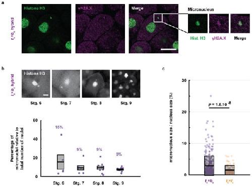 Extended Data Figure 4. Characterization of micronuclei in te×bs hybrid embryosa, DNA damage in te×bs hybrid embryo micronuclei. Whole mount embryo immunofluorescence was performed in te×bs hybrid embryos using anti-histone H3 (left) and anti-γH2A.X (middle) antibodies, corresponding channels are shown in green and magenta, respectively. The merged image is shown on the right. 34 micronuclei within 8 different embryos were analyzed. Micronuclei with damaged DNA were observed in all analyzed embryos. Zoomed images of micronuclei are shown on the right in the same left-to-right order. Scale bar is 20 μm. b, Micronuclei in te×bs hybrid embryos at various developmental stages (top). Whole mount embryo immunofluorescence was performed in te×bs hybrid embryos using anti-histone H3 antibody at stages 6, 7, 8 and 9. Scale bar is 20 μm. Quantification of micronuclei in te×bs hybrid embryos (bottom). The percentage of micronuclei was calculated as the number of micronuclei in the imaged portion of the embryo divided by the total number of nuclei in the same imaged portion. The average percentage for multiple embryos at stage 6 (n = 5 te×bs hybrid embryos (individual dots) with a total of 125 nuclei), stage 7 (n = 7/153), stage 8 (n = 9/731) and stage 9 (n = 10/2691) is shown as a thick line. Gray boxes correspond to 1 standard error of the mean. Control X. tropicalis embryos from the same mothers were analyzed but no micronuclei were observed at any stages. c, Micronuclei size in te×bs and te×ls hybrids. Size is plotted as the ratio between the volumes of the micronucleus and its corresponding nucleus. Each dot represents an individual data point (n = 329 micronuclei from 36 te×bs embryos shown in purple and n = 100 from 17 te×ls embryos shown in orange, from 4 independent experiments). The thick black line indicates the average and the grey box corresponds to 1 standard deviation. 95% confidence intervals are 2.9±0.36% for te×bs and 1.6±0.28% for te×ls embryos. Statistical significance was shown using a two-tailed heteroscedastic t-test. |