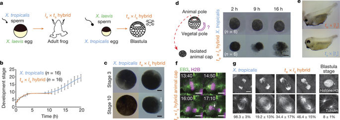 Figure 1. a, Schematic of X. laevis and X. tropicalis cross-fertilization outcomes. b, Developmental timing in X. tropicalis and te × ls hybrid embryos. Average is plotted for each time point. Error bars, s.d. c, Representative images of X. tropicalis and te × ls hybrid embryos at stages 3 and 10 from experiments in b (n = 16 X. tropicalis and n = 16 te × ls hybrid embryos from four independent experiments). Arrow indicates vegetal cells where death initiates. d, Schematic of animal cap assay and images of at 2, 9, and 16 h after isolation. Six animal caps were imaged and identical results were obtained in three different experiments. Scale bars in c and d, 200 μm. e, Images showing haploid phenotype following fertilization of X. tropicalis eggs with ultraviolet-irradiated sperm. Identical results were observed in n = 3 experiments. f, Time-lapse images of dividing cell in a te × ls hybrid animal cap (Supplementary Video 5). Arrow indicates a mis-segregated chromosome. Mis-segregated chromosomes were observed in n = 3 live te × ls hybrid animal caps in three experiments. Time is in minutes:seconds. g, Immunofluorescence images showing chromosome bridges, mis-segregated chromosomes, and micronuclei throughout te × ls hybrid embryos. Scale bars in f and g, 10 μm. Quantification of n = 81 X. tropicalis and n = 78 te × ls hybrid anaphases in n = 17 and 16 embryos, respectively, from four datasets obtained from three experiments presented as averages ± 1 s.d., show a significant difference by Fisher’s 2 × 3 contingency test (P = 0). Quantification of micronuclei in te × ls hybrid embryos is detailed in Extended Data Fig. 1b. |